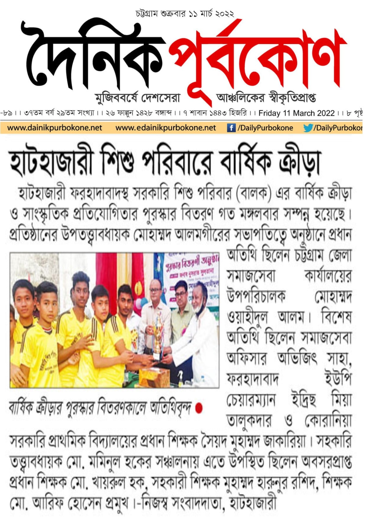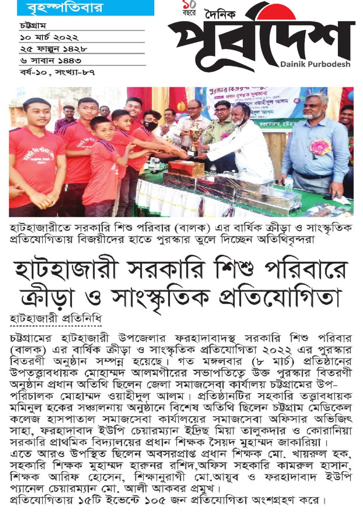 সরকারি শিশু পরিবার (বালক),ফরহাদাবাদ,হাটহাজারী,চট্টগ্রাম এর বার্ষিক ক্রীড়া ও সাংস্কৃতিক প্রতিযোগিতা ২০২২ এর পুরস্কার বিতরণী অনুষ্ঠান মঙ্গলবার (৮ মার্চ) সম্পন্ন হয়েছে। প্রতিষ্ঠানের উপতত্ত্বাবধায়ক মোহাম্মদ আলমগীরের সভাপতিত্বে অনুষ্ঠানে প্রধান অতিথি ছিলেন জেলা সমাজসেবা কার্যালয়,চট্টগ্রামের উপপরিচালক মোহাম্মদ ওয়াহীদুল আলম মহোদয়। বিশেষ অতিথি ছিলেন চট্টগ্রাম মেডিকেল কলেজ হাসপাতাল সমাজসেবা কার্যালয়ের সমাজসেবা অফিসার অভিজিৎ সাহা,ফরহাদাবাদ ইউপি চেয়ারম্যান ইদ্রিছ মিয়া তালুকদার ও কোরানিয়া সরকারি প্রাথমিক বিদ্যালয়ের প্রধান শিক্ষক সৈয়দ মুহাম্মদ জাকারিয়া। সহকারি তত্ত্বাবধায়ক মোঃ মমিনুল হকের সঞ্চালনায় এতে আরও উপস্থিত ছিলেন অবসরপ্রাপ্ত প্রধান শিক্ষক মো. খায়রুল হক,সহকারি শিক্ষক মুহাম্মদ হারুনর রশিদ,অফিস সহকারি মোঃ কামরুল হাসান,শিক্ষক মোঃ আরিফ হোসেন,শিক্ষানুরাগী মো.আয়ুব ও ফরহাদাবাদ ইউপি প্যানেল চেয়ারম্যান মো. আলী আকবর,সুবীর মিত্র,মো. বসু মিয়া,মো. মিনহাজ,অভিজিৎ দাশ ও মো. শরীফ উদ্দিন প্রমুখ। প্রতিযোগিতায় ১৫টি ইভেন্টে ১০৫ জন প্রতিযোগী অংশ গ্রহণ করে। সবশেষে প্রধান অতিথি বিভিন্ন ইভেন্টে বিজয়ীদের হাতে পুরস্কার তুলে দেন।